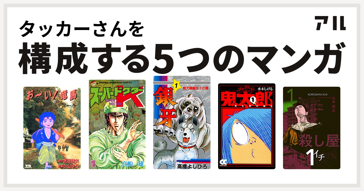 タッカーさんを構成するマンガはお い 竜馬 スーパードクターk 銀牙 流れ星 銀 ゲゲゲの鬼太郎 殺し屋1 イチ 私を構成する5つのマンガ アル